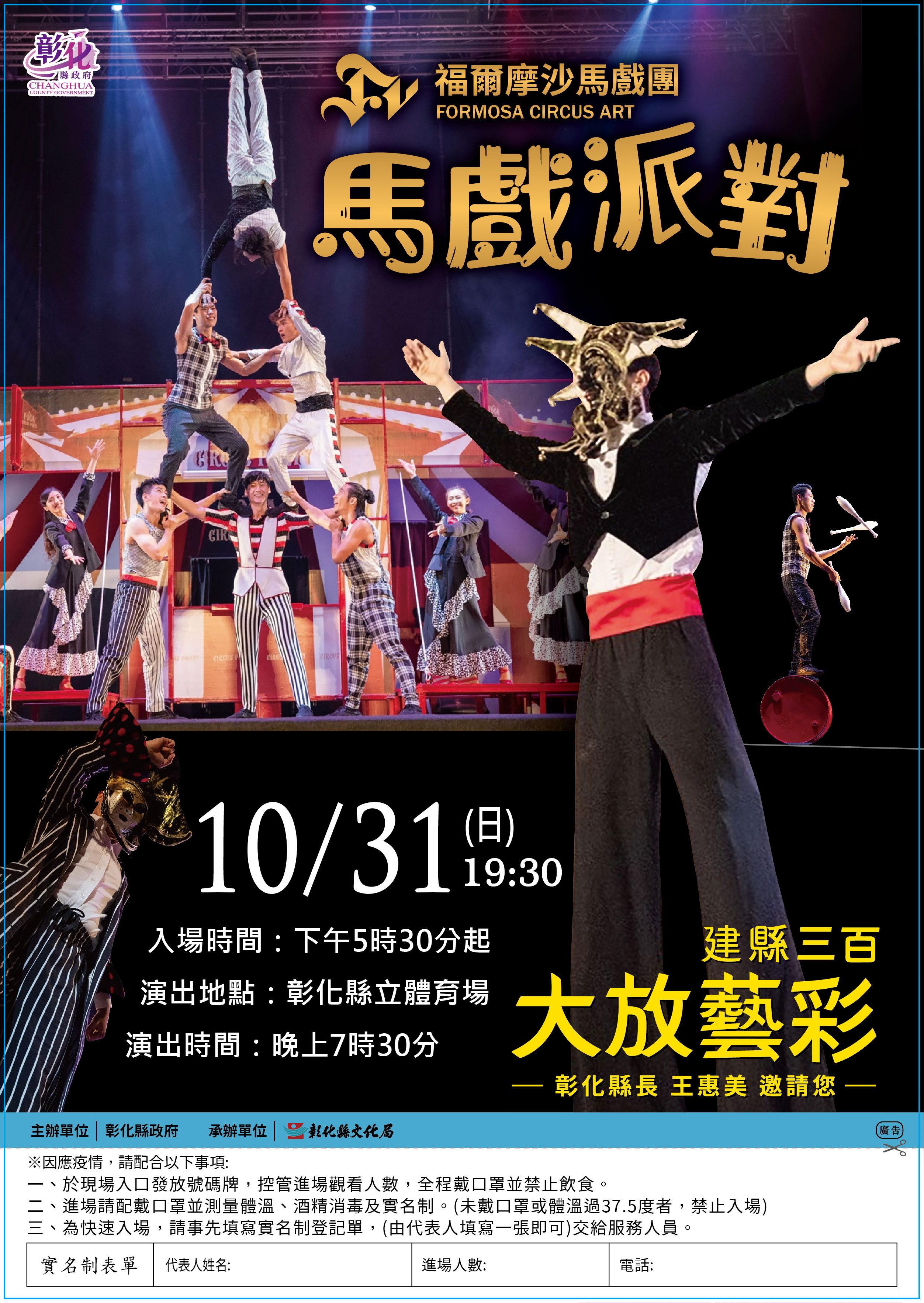 說明: 一、旨揭活動110年10月31日(週日)晚間7時30分於彰化縣立體育場演出。 二、檢附FOCA福爾摩沙馬戲團馬戲派對海報電子檔1份(如附件)。