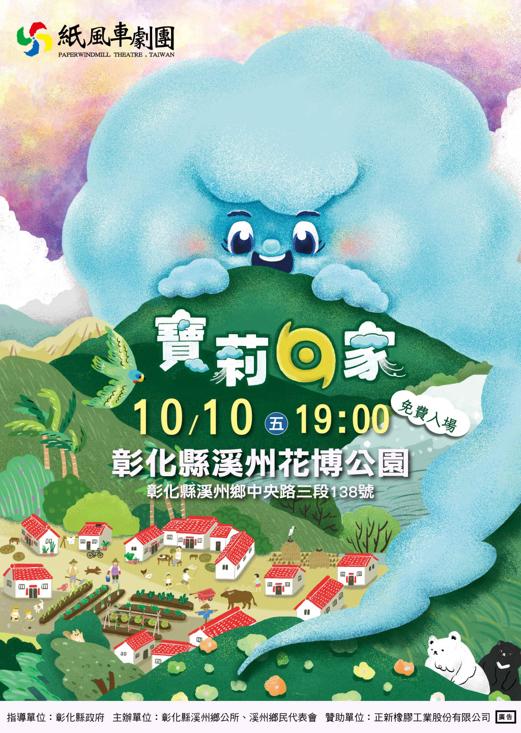 播放內容:10月10日(星期五)晚上7點於溪州鄉溪州公園,演出「紙風車兒童劇團」《寶莉回家》,免票入場,歡迎闔家觀賞。