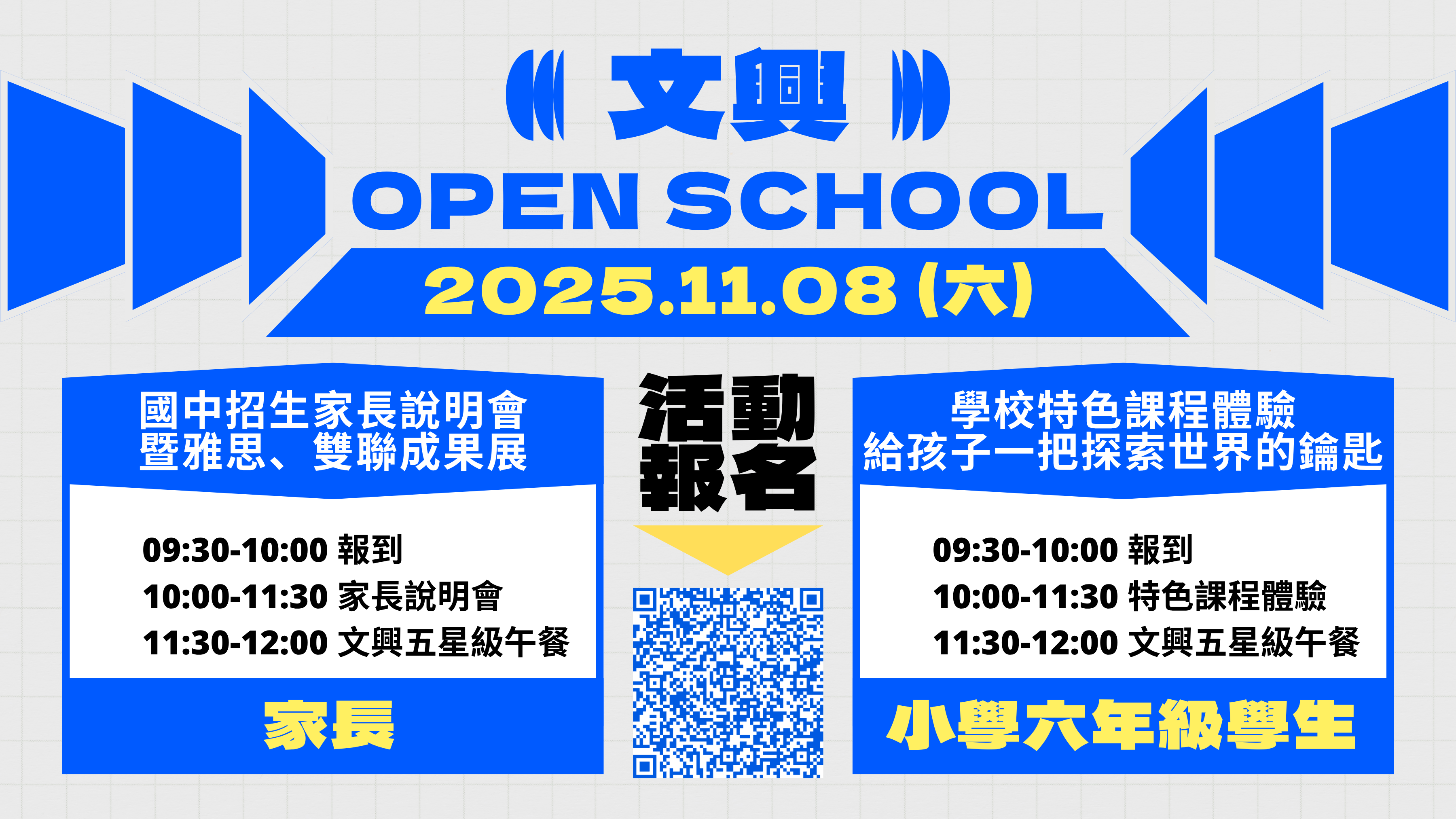 一、本校訂於114年12月21日(星期日)舉辦114年國小核心素 養能力體驗營。相關活動網址請參考本校學校網頁 https://web1.hshs.chc.edu.tw/bin/home.php。 二、敬請惠予張貼海報公佈(如附件一),並將活動簡章轉發所 屬六年級學生,倘有不足請來電賜知或參考本校學校網 頁。 三、本校秉持天主教教育精神並善盡學校社會責任,訂定「清 寒優秀學生入學獎助學金辦法」,獎助本縣清寒優秀學生 就讀文興中學,以本校慈善公益基金及社會捐助款,幫助 清寒學生用教育翻轉人生,相關辦法如(附件),請惠予推 薦貴校優秀清寒學生。四、為使社區家長了解本校基督為本的核心教育理念,並讓社區學生認識天主教學校,特於114年11月8日(六)上午文興 OPEN SCHOOL DAY辦理學生闖關遊戲及家長說明會,活動說 明(如附件三)。 五、核心素養體驗營活動個人獎勵:體驗營金興獎1-5名、體驗 營銀興獎6-10名、體驗營銅興獎11-15名、體驗營成績優良 獎16~20名、體驗營希望之星獎21~40名,以上獲獎頒發獎 狀乙張,獎狀送至就讀學校。 六、本次活動排名前40名學生,依本校入學辦法就讀本校時, 另提供優厚獎助學金,詳情請見活動簡章。 七、敬請 貴校惠予公佈轉知。