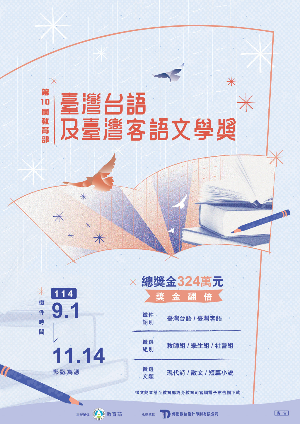 轉知教育部「第十屆教育部臺灣台語及臺灣客語文學獎」徵文時間展延至114年11月14日,請踴躍參加,請查照。