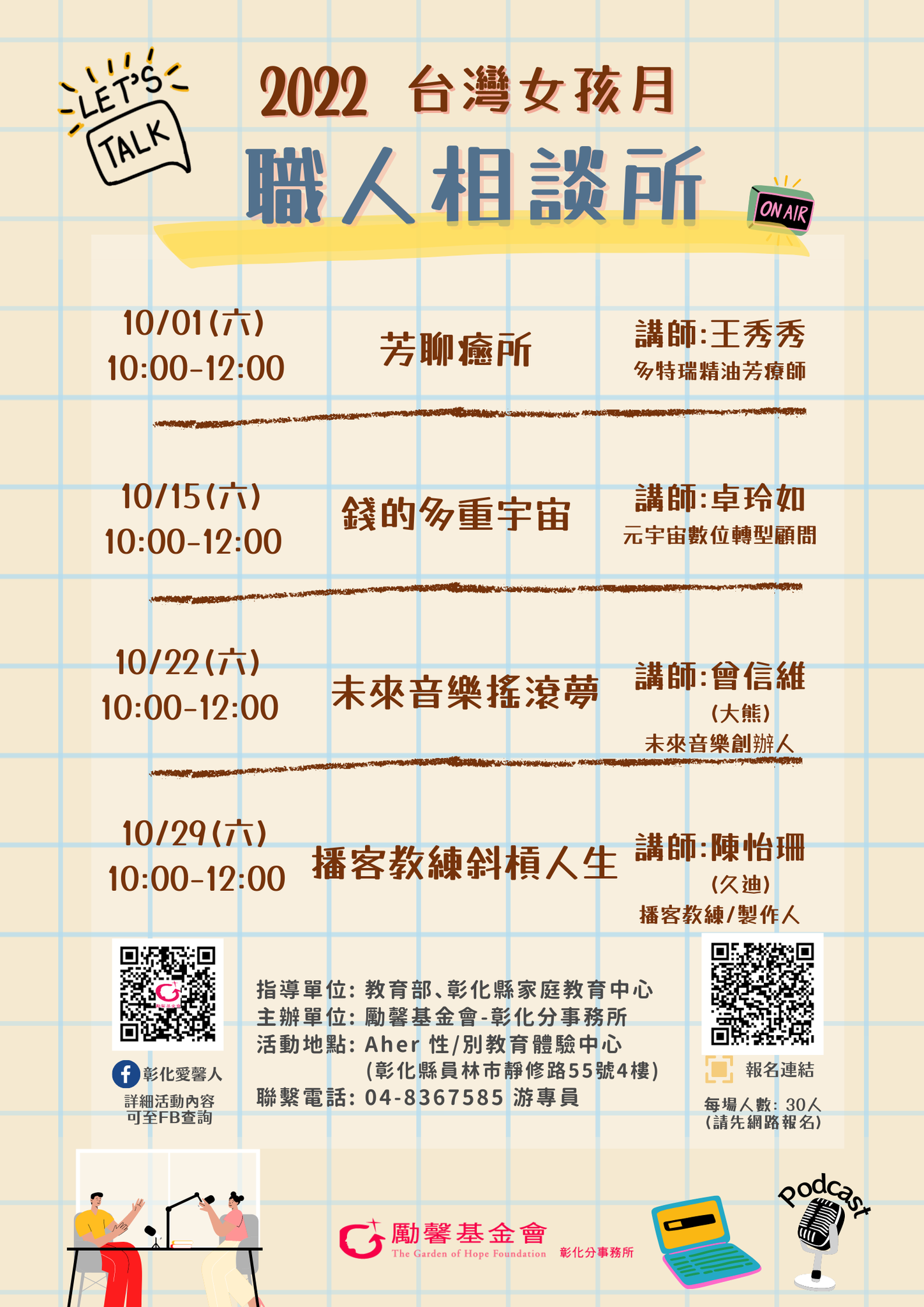 二、辦理目的: (一)推行台灣女孩日及其理念 1、辦理相關活動,向民眾宣傳女孩日核心概念(充權女 孩、培力女孩、投資女孩、平權女孩)。 2、提供場域讓更多社區民眾共同參與性別議題,將性別 平權觀念深植在地。 3、藉由活動舉辦,打破舊有迷思,推動職業不分性別。 (二)鼓勵青少年生涯探索 1、本課程符合108年度課綱設計,能讓學生應用在學習歷 程檔案之中。 2、透過專業人士的經驗分享,提升青少年認識不同場域 之發展,試探與發展多元專業之能。 3、借鑒他人經驗,提早進行生涯探索,有效規劃自我生 涯發展。