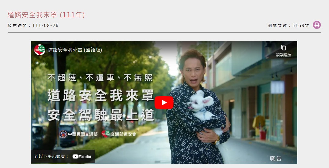 | (一) | 交通部製作「道路安全我來罩」影片連結:交通安全入口網/教材文宣/影片專區https://168.motc.gov.tw/theme/video/post/2208261014899。 |
